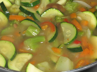 In a large saucepan, combine 1/2 cup chicken broth with 1/2 cup water. Add stir fry vegetables. Bring to a boil; reduce heat to medium and boil 3-4 minutes or until vegetables are just starting to get tender. Stir in sliced zucchini and cook an additional 2-3 minutes.